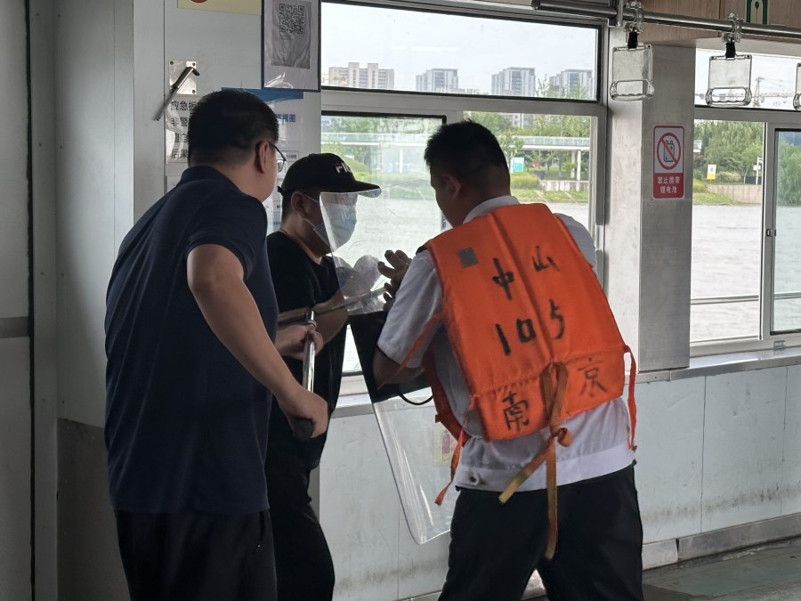 演练中,“乘客”指认“纵火人”后,配合水手对其进行控制。水手将情况报告船长,船长将情况分别向水上分局指挥室、南京海事局交管中心以及公司监控指挥中心进行报告。